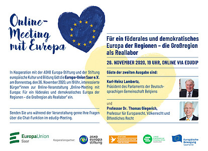 Mitglieder des Landesvorstands der Europa-Union Saar haben ein Strategiepapier zur Föderalisierung und Demokratisierung Europas verfasst. Grenzregionen wie die hiesige sollen dadurch mehr Souveränität erhalten. Diskutiert wurden die Thesen beim zweiten Online-Meeting mit Europa mit Prof. Dr. Thomas Giegerich, Europarechtler von der Universität des Saarlandes und mit Karl-Heinz Lambertz, Parlamentspräsident der Deutschsprachigen Gemeinschaft Belgiens. » weiterlesen