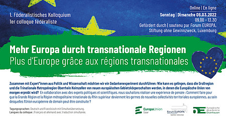 Avec le soutien principal du Forum EUROPA, fondation sans but lucratif, Luxembourg, et en coopération avec l'Académie Européenne d'Otzenhausen et d'autres partenaires européens de la Grande Région et de la Région du Rhin Supérieur, l'Union des fédéralistes européens de la Sarre (Europa-Union Saar) invite les citoyens intéressés à un colloque le dimanche 6 mars 2022, de 9h30 à 13h30.