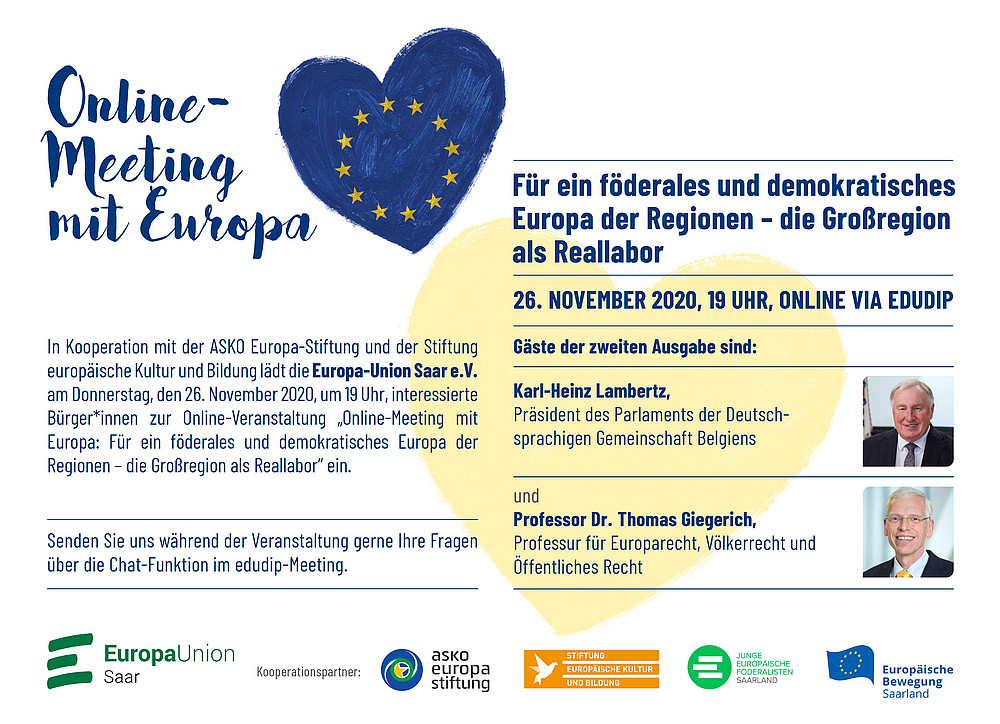Zusammen mit der ASKO Europa-Stiftung, der Stiftung europäische Kultur und Bildung, JEF Saarland und der Europäischen Bewegung Saar lädt die Europa-Union Saar am Donnerstag, den 26. November 2020, um 19 Uhr, interessierte Bürger*innen zur Online-Veranstaltung “Online-Meeting mit Europa: Für ein demokratisches und föderales Europa der Regionen: die Großregion als Reallabor” ein.
