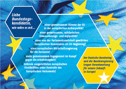 In diesen Wochen machen wir die Bundestagskandidatinnen und -kandidaten auf unsere Forderungen aufmerksam. Herzstück der Kampagne ist eine Postkartenaktion, mit der Wählerinnen und Wähler an die Verantwortung ihrer künftigen Abgeordneten für unsere Zukunft in Europa appellieren und ihre Erwartungen deutlich machen können. Unsere Landes- und Kreisverbände vor Ort suchen das direkte Gespräch mit den Parteienvertretern und laden deutschlandweit zu Podiumsdiskussionen und Veranstaltungen zur Bundestagswahl ein.