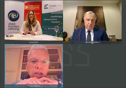 Diskutiert wurden diese Thesen beim zweiten “Online-Meeting mit Europa” am 26. November mit Prof. Dr. Thomas Giegerich, Lehrstuhl für Europarecht, Völkerrecht und Öffentliches Recht, Direktor des Europa Institut der Universität des Saarlandes und Karl-Heinz Lambertz, Präsident des Parlaments der Deutschsprachigen Gemeinschaft Belgiens. Auch wenn die vermittelte Vision beiden begeisterten Europäern aus der Seele sprach wie sie sagten, so plädierten sie dennoch für kleinere machbare Schritte auf dem Weg dorthin.