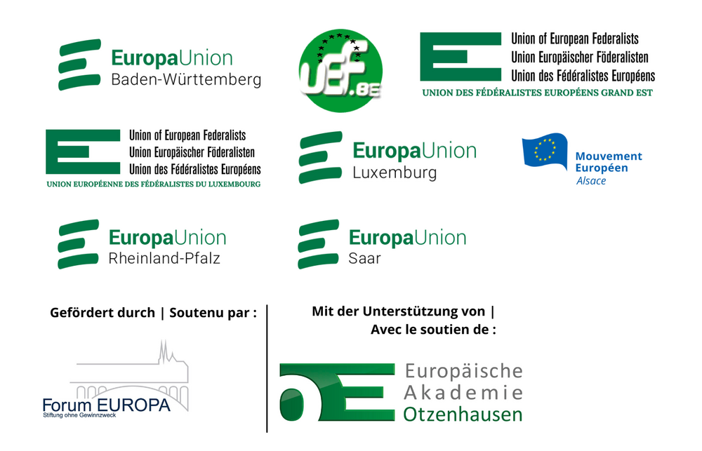 Depuis plus d'un an, les fédéralistes européens de la Sarre préparent un colloque scientifique et politique sur la base de ce document stratégique, en collaboration avec des associations partenaires fédéralistes de la Grande Région et de la région du Rhin supérieur. Dans le cadre d'entretiens avec des experts et de groupes de travail, les participants souhaitent déterminer comment les deux espaces de coopération européens que sont la Grande Région et la région du Rhin supérieur peuvent devenir les germes d'une république fédérale européenne. La réalisation de ce projet est due au généreux soutien financier (financement complet) du Forum EUROPA, fondation sans but lucratif, Luxembourg. En tant que membre du groupe "Partenaires pour l'Europe", la fondation s'engage pour la promotion d'une Europe des citoyens dans la Grande Région.