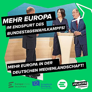 In einem offenen Brief fordern die Jungen Europäischen Föderalisten, die Europa-Union Deutschland und das Netzwerk EBD die privaten und öffentlich-rechtlichen Sendeanstalten auf, in den verbleibenden Diskussionsrunden mit den Spitzenkandidatinnen und Spitzenkandidaten gezielt europapolitische Themen aufzugreifen.
